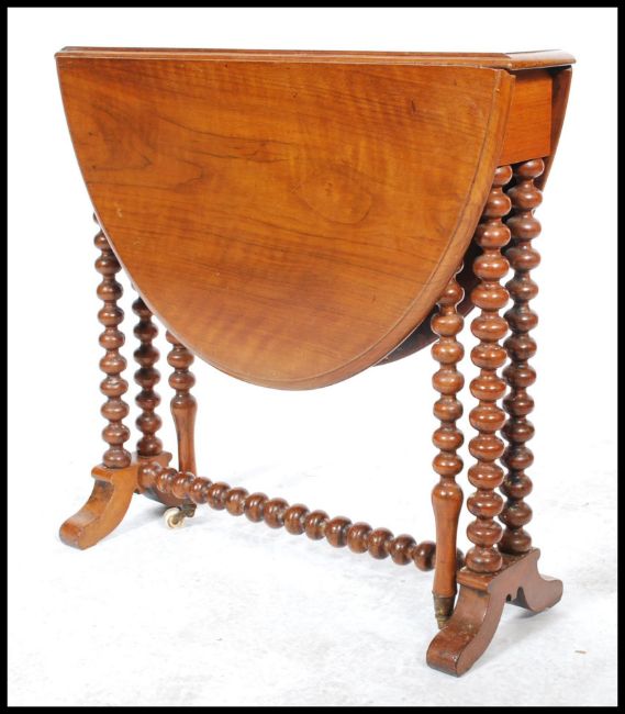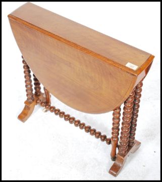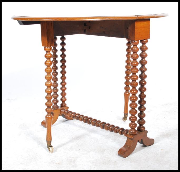 A 19th century Victorian walnut oval Sutherland table, moulded top, turned twin bobbin legs, ceramic casters. Measures 59cm x 61cm x 22cm.