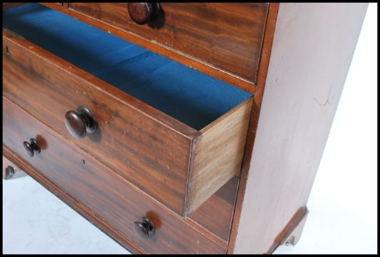 An early 19th century Georgian mahogany chest of drawers raised on bracket feet. The bank of two over three drawers having brass locks and key escutcheons with knob handles. Measures 102cm x 107cm x 53cm.