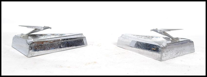 A pair of 1930's American Art Deco chrome ashtrays of angular form with eagle adorned tops. Each ashtray marked to the underside for BCM WDC. Measures 15cms long each.