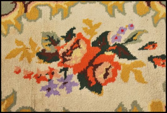 An early 20th century Tibetan floral rug.  The green ground with large central medallion of flowers surrounded by decorative swirling spandrels and tassled ends. Measures 155cms x 92cms