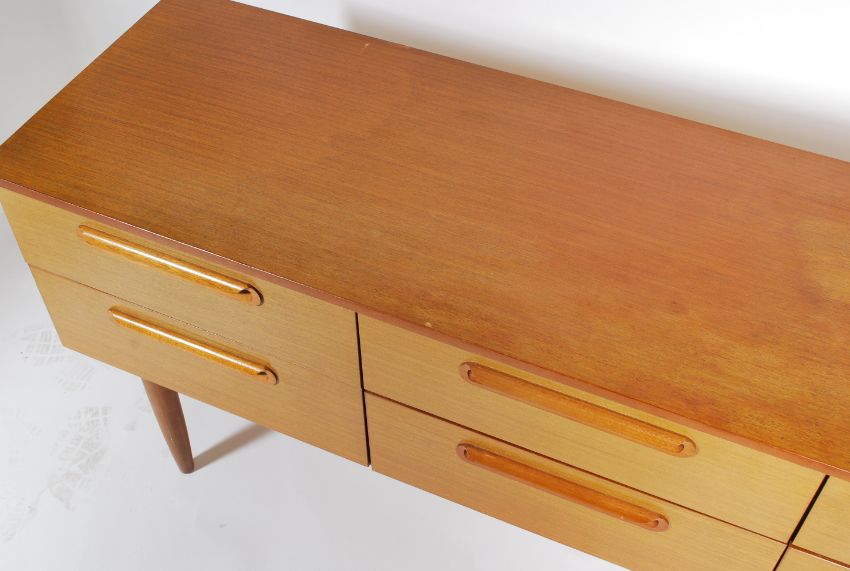 A retro 20th century teak wood sideboard, six drawers raised on shaped supports united bt stretchers.