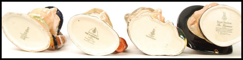 A group of four Royal Doulton character jugs to include The Fireman D6697 , The Gardener D6630 and D6867 and the Golfer D6623. Measures 20cms high. Note; from an extensive private collection of Royal Doulton. The vast majority of items are free from any damage or restoration, and are in great condition. Buyers are reminded for the need to satisfy themselves as to condition of individual lots prior to bidding as condition on some, will vary.