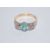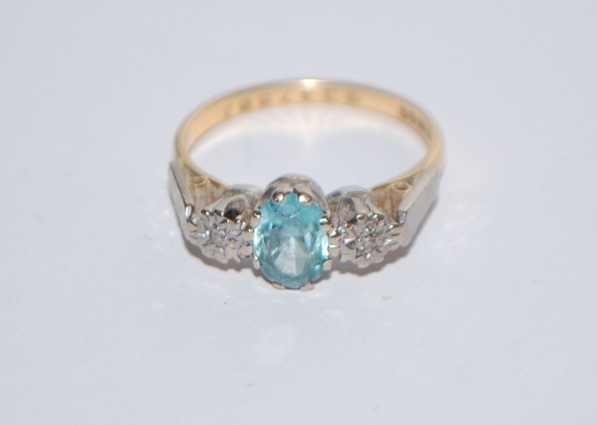 A hallmarked 18ct gold ring set with a central oval cut blue stone flanked by two illusion set diamonds  the ring having star cut shoulders.  Hallmarked Birmingham. Size N.5. Weight 3.7g.