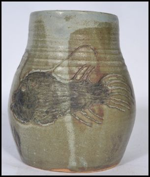 A 20th century studio pottery vase in the manner of Martin Brothers depicting a grotesque football fish. Measures 19 cm high.