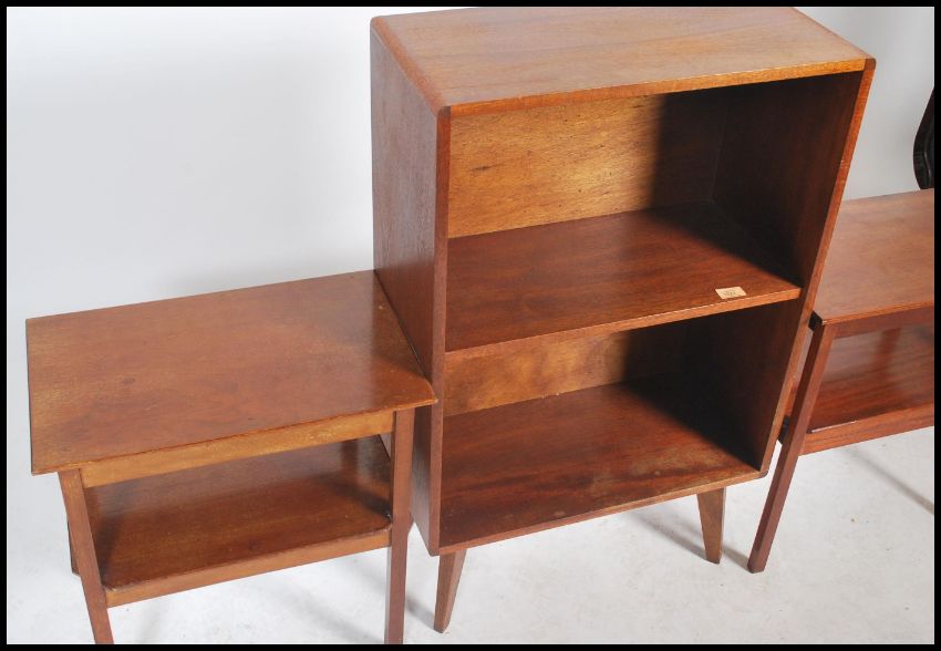 A 1960's retro teak two shelf bookcase raised on tapered angular legs together with a pair of teak two tier side / bedside tables. Measures  91cm x 56cm x 27cm.