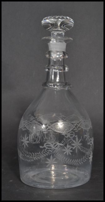 A 19th century Georgian hand blown cut glass decanter having an engraved body. The decanter of mallet form with knopped neck and faceted stopper. Measures 24cm high.