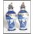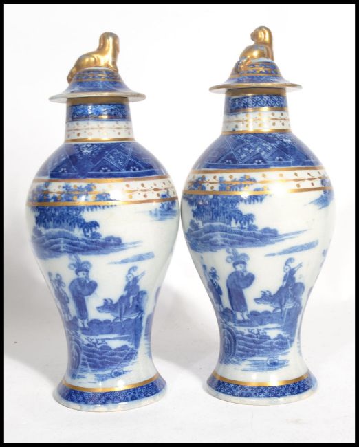 A pair of 19th century English pearlware pearl ware blue and white Oriental Chinese style vases having tapering bulbous bodies with waisted necks and gilt dog finial lids. Hand painted of man riding a cow  and foliage.