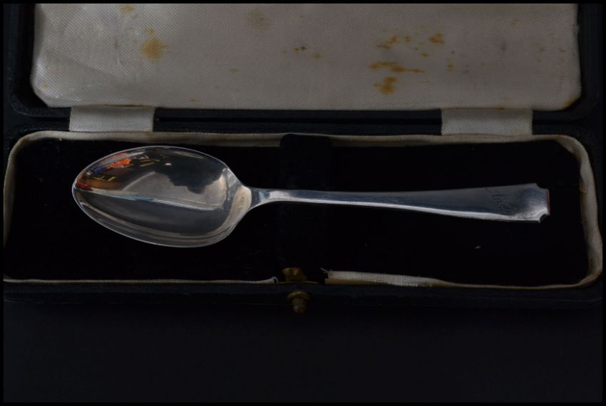 A silver hallmarked 18th century pickle fork, Ivory handle together with a hallmarked cased Christening spoon and a pair of sugar tongs. Longest 15.5cm.