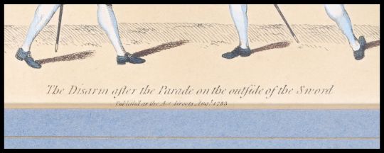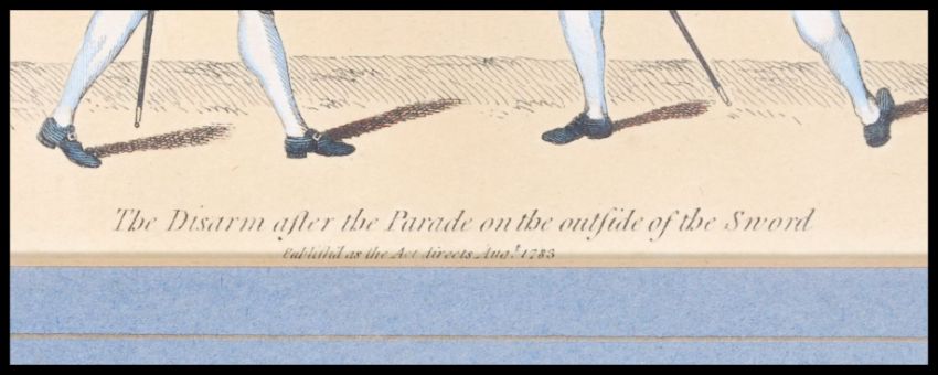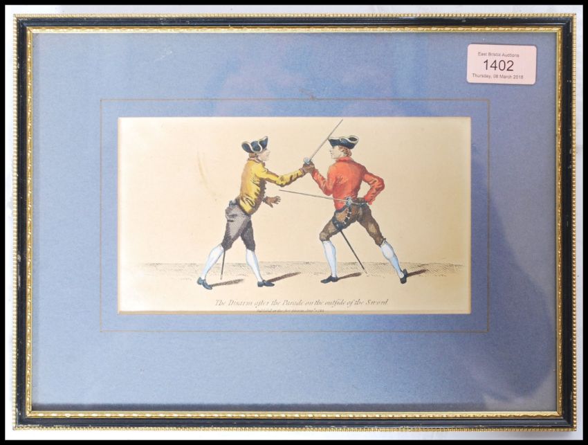 An interesting 18th century colour print of 2 gentleman fencers ( fencing interest ) entitled ' The disarm after the parade on the outside of the sword '  Published 1783 Measures 31cms x 23cms