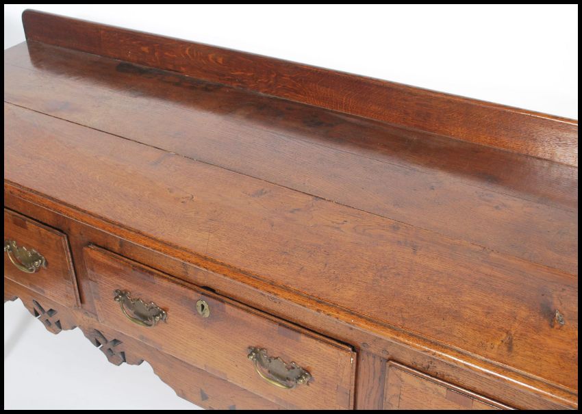 An 18th / 19th century oak dresser base being raised on cabriole legs with pointed hoof feet supporting a wide body with fitted 3 deep drawers, pierced arcade to the underside. Above  a flared top with stage gallery back. Measures 88cm x 183cm x 54cm.