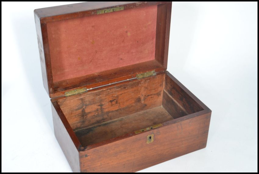 A 19th century Victorian work box walnut construction having hinged top together with another mahogany example, each of rectangular form