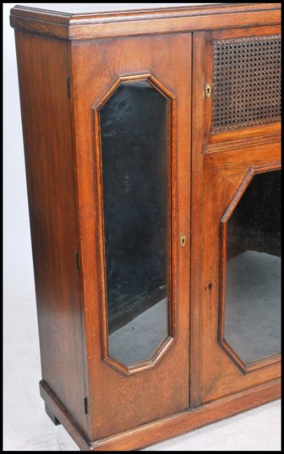 A 1930's large French oak library bookcase cabinet having end glass sentry box bookcase cabinets flanking a rattan weave cabinet over further cabinet beneath