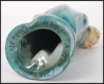 A rare Doulton figure; HN51 "A Spook", designed by Harry Tittensor and produced between 1916 and 1933, incised 176 to base and handwritten details, in colourway pale blue robe and red cap. Doulton Titanian Condition report : Some glaze rub to the base around the text as in the images. mall blim to nose, possibly original or a firing fault, small pock marks in the cast itself that are original and mentioned only for accuracy. Note; from an extensive private collection of Royal Doulton. The vast majority of items are free from any damage or restoration, and are in great condition. Buyers are reminded for the need to satisfy themselves as to condition of individual lots prior to bidding as condition on some, will vary.