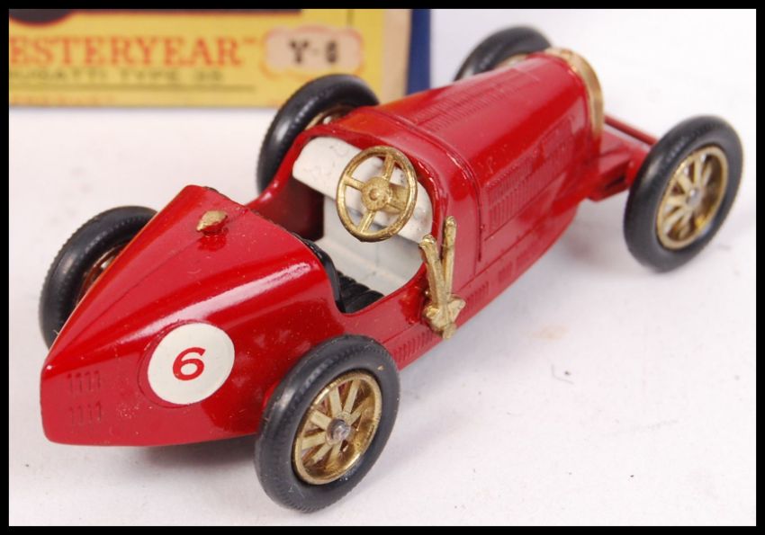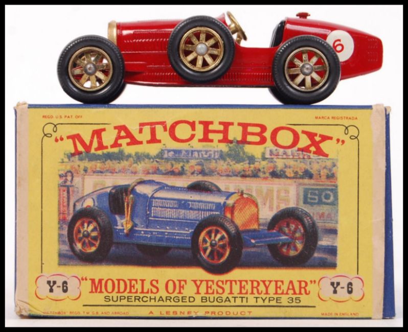An original rare variation Matchbox Models Of Yesteryear Lesney Y-6 1926 Bugatti Type 35. Red body, No. 6 decal with rare gold radiator variation. Within the original blue variation box.