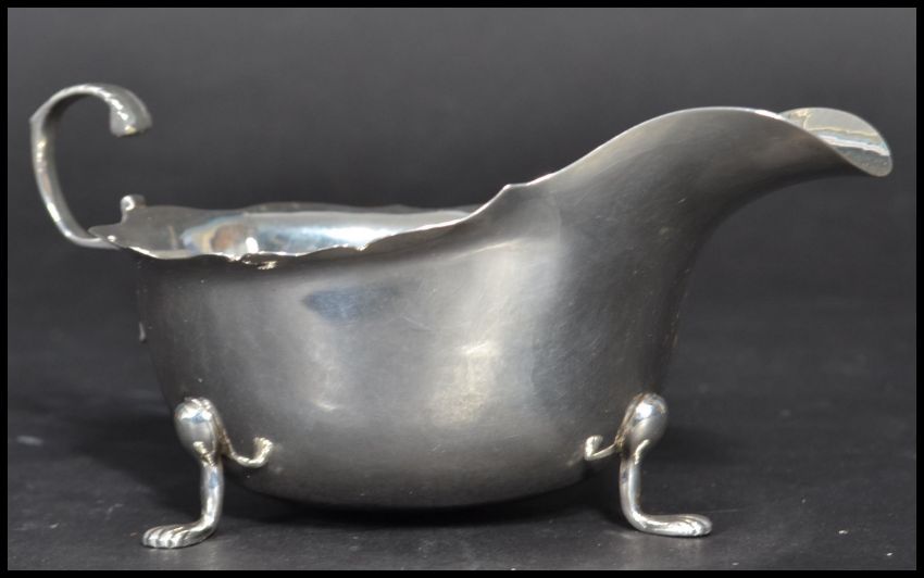 An early 20th century silver hallmarked Edwardian sauce boat having a shaped scroll handle raised on tripod paw feet. Hallmarked for Chester 1908 makers Nathan and Hayes. Weighs 91 grams. Measures 15 cm deep.