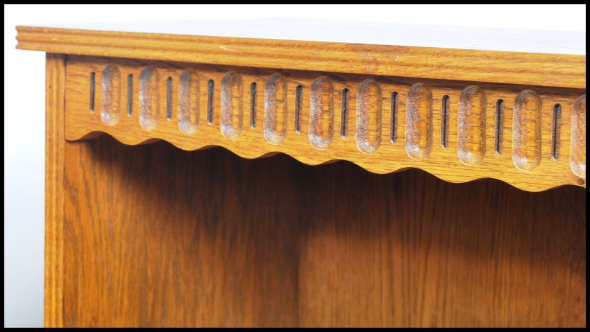 A pair of 20th century matching oak open bookcases each with a series of adjustable shelves raised on plinth bases. Measures 100cm x 75cm x 32cm.