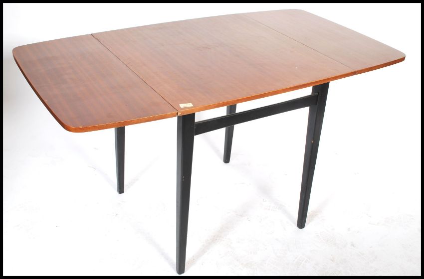 A vintage retro 20th century teak drop leaf extending dining table raised on tapering ebonised legs.