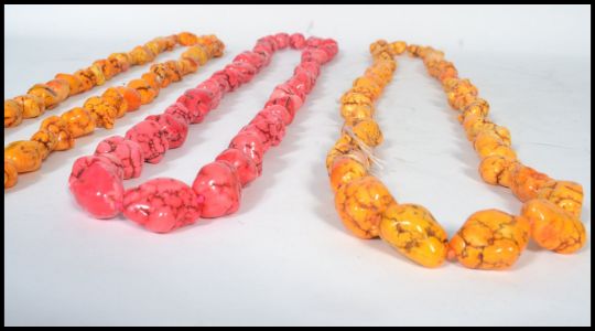 A group of three large and heavy painted stone necklaces. The stones of varying form and sizes. Please see images. Measures 62cm long.