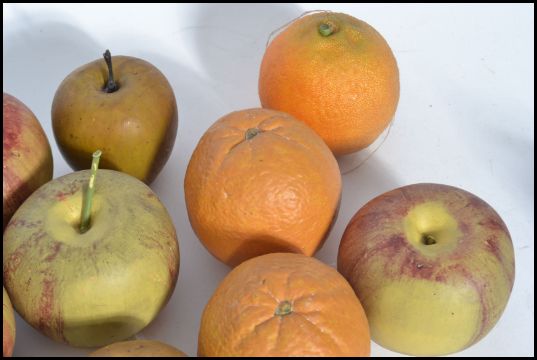 A group of early 20th century ceramic fruit ornaments to include oranges and apples. Hand painted with stems. Measures to scale.