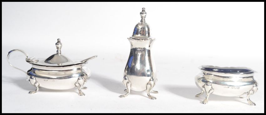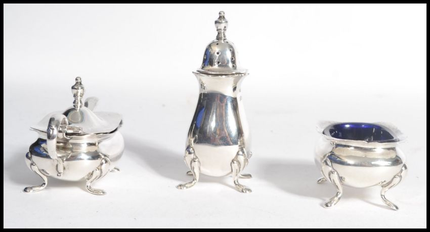 A silver hallmarked silver condiment set comprising of a pepperpot , mustard and salt pots with original blue glass liners and silver mustard spoon. Birmingham 1919 and 1922 by Edwart Souter Barnsley and Adie Brothers. Total Weight gross 148 grams. Highest measures 8 cm.