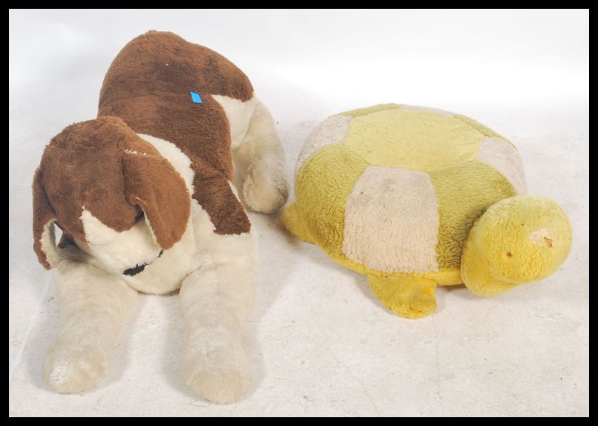 A vintage large 20th century circa 1970's oversized St Bernard teddy bear dog together with a vintage patchwork Turttle foot stool, named Brunard and Torty. Measures 122cm long.