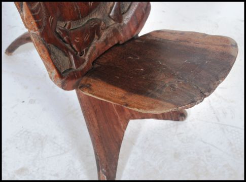 An early 20th century African Kenyan hardwood birthing chair comprised of two parts with carved detailing depicting animals and foliage.