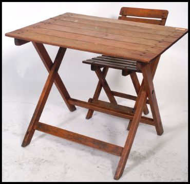 A retro 1970's child's camping teak slatted folding table / desk with matching chair. Measures 50cm x 60cm x 47cm.