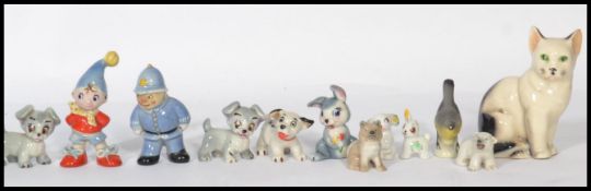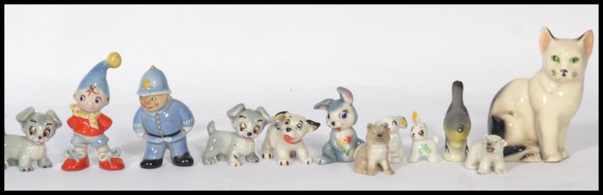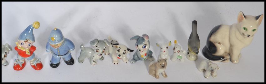 A collection of Wade Whimsie figures to include Noddy, policeman, Disney figures such as Lady, Dalmatian etc together with other ceramic figures to include rabbit, cats, horse etc please refer to images. Highest measures 9 cm.