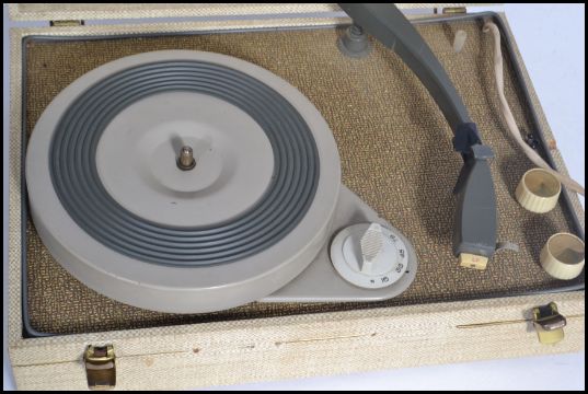 A vintage retro 20th century electric record player. The portable record deck housed within a vinyl case.