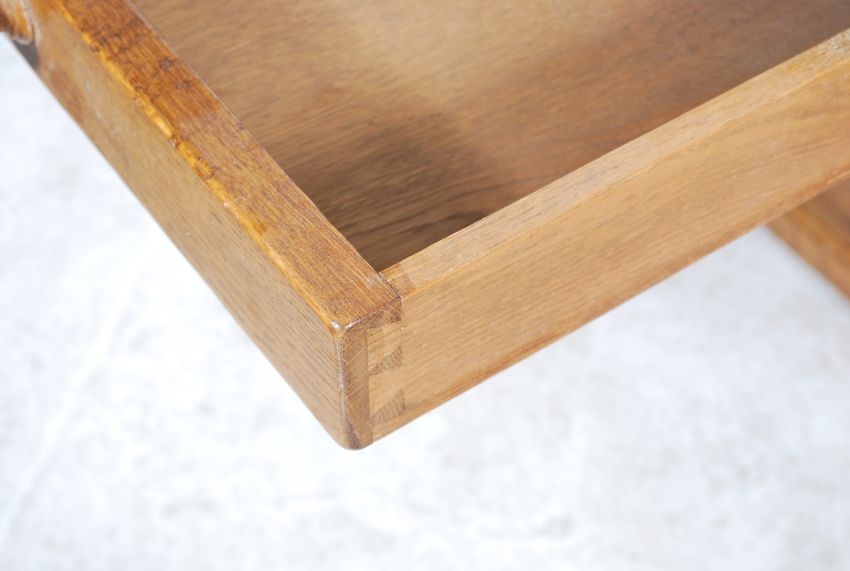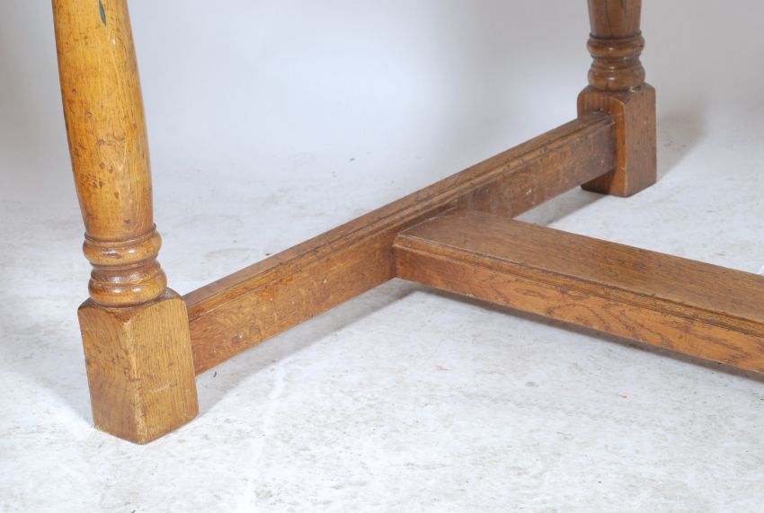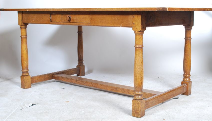 A large 20th century good quality country oak refectory dining table being raised on turned legs with peripheral stretchers. Above a fitted frieze frame with cutlery drawer and planked top above