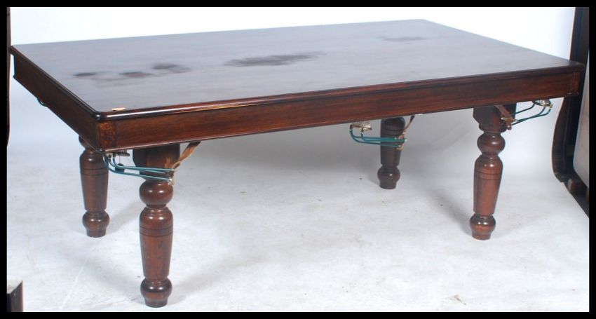 A good modern snooker table  - dining table combination in oak having a large table top cover lifting off to reveal a snooker table. Raised on large turned legs. Makers label for Pegasus of Crewe, England.