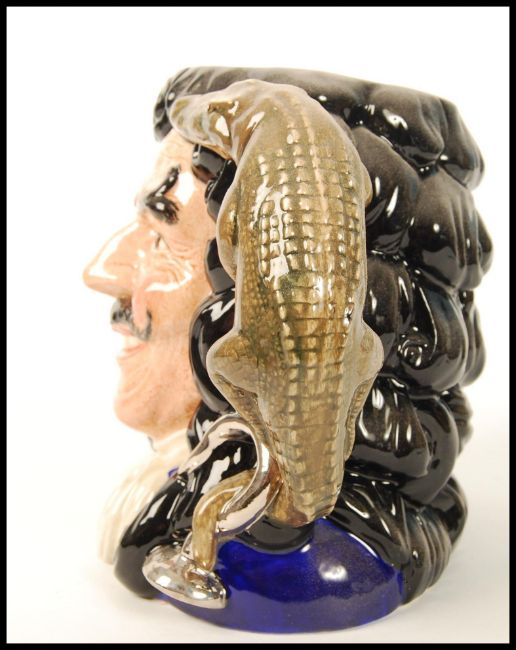 A rare Royal Doulton character jug depicting Dustin Hoffman as Captain Hook from the 1991 movie Hook D6947 , handle modelled as the crocodile from the movie, unusual blue , gilt and silver colourway variant, Doulton designer Martyn CR Alcock with marking on base for ' GT Original Sample ' character jug of the year 1994. Measures 17cm tall. Note; from an extensive private collection of Royal Doulton. The vast majority of items are free from any damage or restoration, and are in great condition. Buyers are reminded for the need to satisfy themselves as to condition of individual lots prior to bidding as condition on some, will vary.