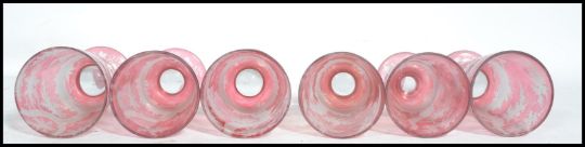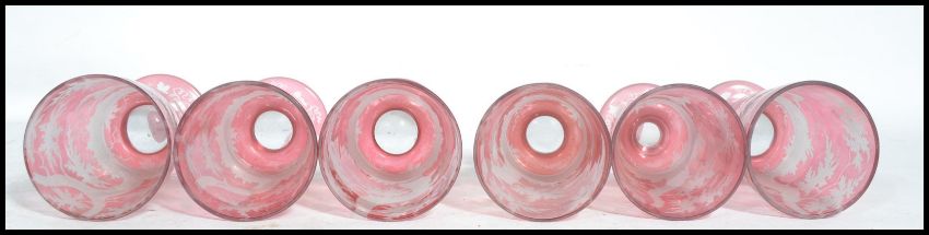 A set of six 19th century hunting theme Victorian Bohemian cut glass goblets. The cranberry glass drinking goblets hand engraved with scenes of animals and foliage. Each raised on a circular foot. Depicting hunting dogs, deer and hares. Measures 14cm high.