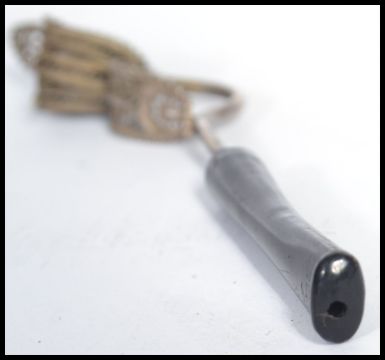 A silver filigree opium pipe having a bowl in the form of a flower with ebonised mouthpiece. Weighs 7.6 grams. Measures 12 cm long.