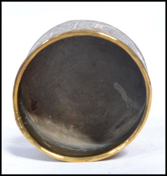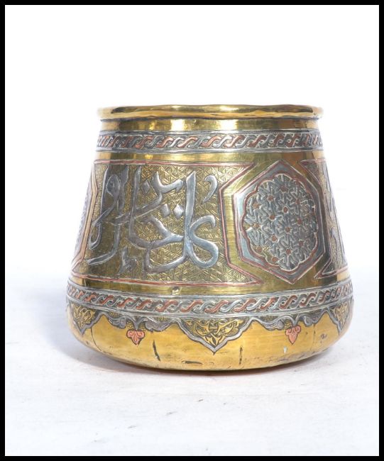 A 19th century Middle Eastern Islamic brass prayer bowl overlaid with silver and copper having script and medallions with geometric borders. Measures 11 cm high and 12 cm diameter.