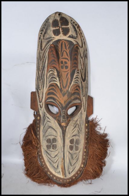 A vintage 20th century Mwai Mash tribal mask from the Tmbunam people middle Septik river area, carved from wood with natutal pigments shells and raffia border.