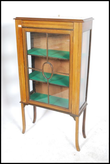 An Edwardian mahogany glass display cabinet with two shelves and astragal glazed front, glass panels to the side, a wooden pediment on top and raised on sabre legs. Measures 140cm x 76cm x 30cm.