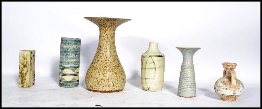 A group of vintage 20th century studio pottery to include a cylindrical vase signed to the base Troika by Simone Killburn, Penzance and other signed pieces. Please see images. Measures 102.5 cm highest.
