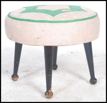 A retro mid century two tone foot stool ( footstool ) by Sherborne. Raised on ebonised dansette legs with a faux leather green and white padded stool top above. 45cm x 30cm x 30cm.