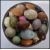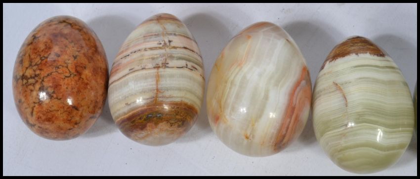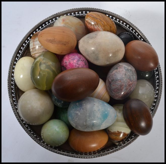 A collection of vintage 20th century semi precious stone and wooden sculptures in the form of eggs, all turned and of similar sizes, displayed within a vintage silver plate tazza. Measures 19 cm high and 26 cm diameter.