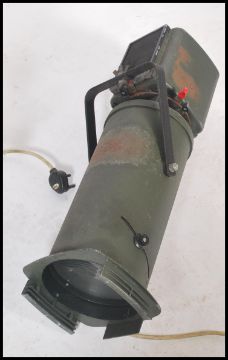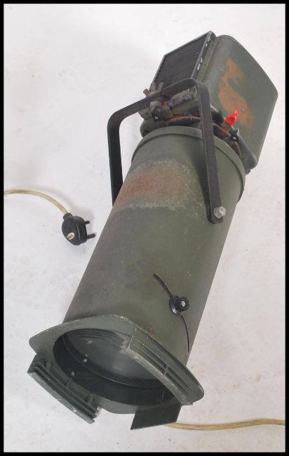 A good pair of mid 20th century Strand Electric Theatre Spot lights in an unusual green colourway with brackets fixed atop. Measures 38cm x 82cm x 23cm.