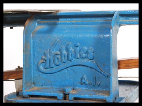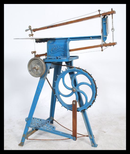 A vintage 20th century industrial Hobbies cast metal pedal foot powered fret saw raised on tripod support having a blue painted finish. Measures 87cms high x 66cm wide.