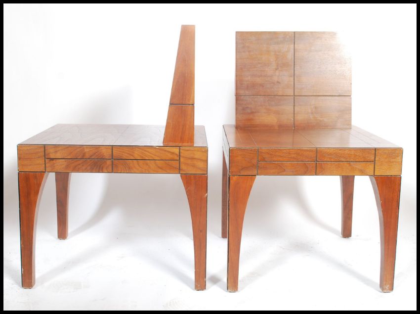 A pair of contemporary walnut Japanese low zen type easy lounge chairs having geometric Rennie Mackintosh influences raised on shaped legs and wedge backrest.