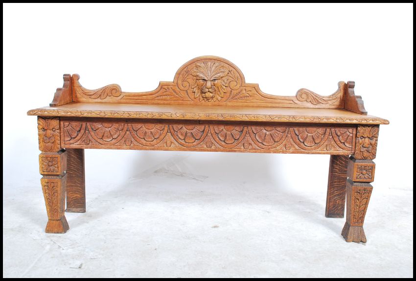 A Victorian 19th century profusely carved oak hall settle / window seat with green man mask to the gallery back, solid seat pad with carved frieze raised on carved block tapering legs. Measures: 65cm high x 122cm wide x 34cm deep.