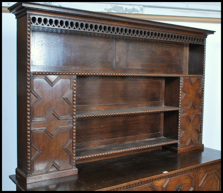 Waring and Gillows - A good quality 20th century oak Jacobean revival dresser, the high back with a moulded cornice above a shaped frieze and an arrangement of cupboards and shelves with inverted geometric moulding, the lower part with a rectangular moulded top above frieze drawers each with conforming geometric moulding and brass droplet handles, raised upon barley twist supports with scalloped rear supports and plain cross stretchers applied label to the rear for Waring and Gillows. Measures: 199cm high x 183cm wide x 53cm deep.