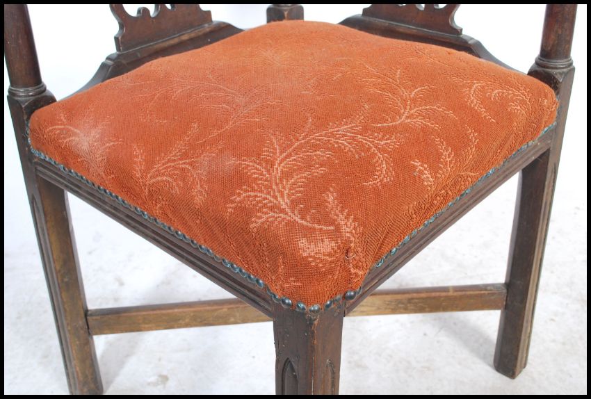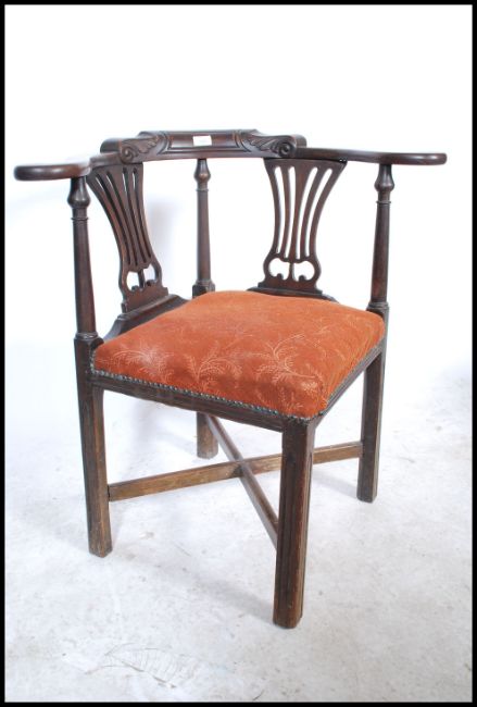 A 19th century Victoruan country house mahogany corner chair / armchair. The curved top rail on lyre splats and circular columns with rectangular seat on square and tapered legs united by a pierced 'X' stretcher