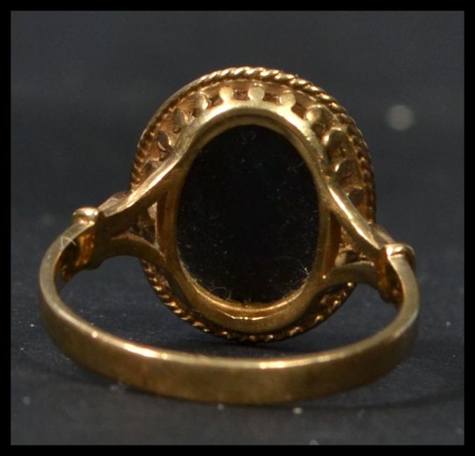 A vintage 9ct hallmarked gold Intaglio / signet ring having inset onyx black stone. Total weight 4.6g