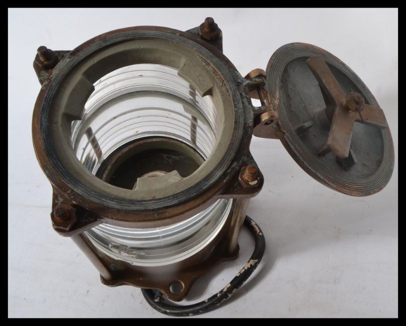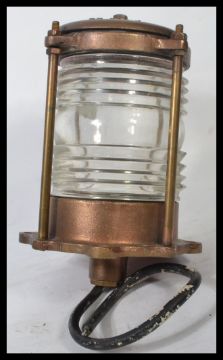 A vintage 20th century brass and wire caged mast lamp having clear glass lining, Stamped L.L.R. Co. Measures 34 cm high.