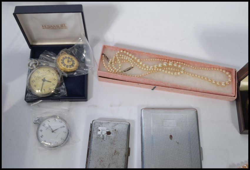 A collection of good vintage costume jewellery to include necklaces, bracelets earrings ( to include 9ct ) silver hallmarked napkin ring, watches, pocket watches, cheroot / cigarette cases etc please refer to images.