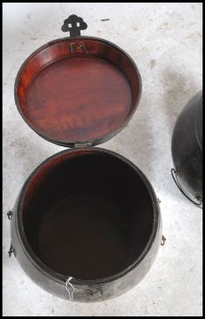 A pair of matching early to mid 20th century Chinese wooden lacquered storage barrels, each fitted with a hinged top having brass lock / clasp to the front. Both decorated with gilt swags and floral motifs.